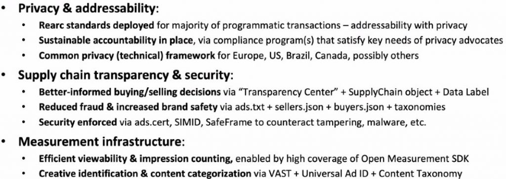 Project Rearc obviously plays a major role in next year’s efforts (for the most recent update on Project Rearc, please visit the webinar page here), work has already started on standards for improved buy-side transparency (i.e. buyers.json) and leveraging the capabilities of Open Measurement for more devices and products will be an important evolution. Lots to look forward to…