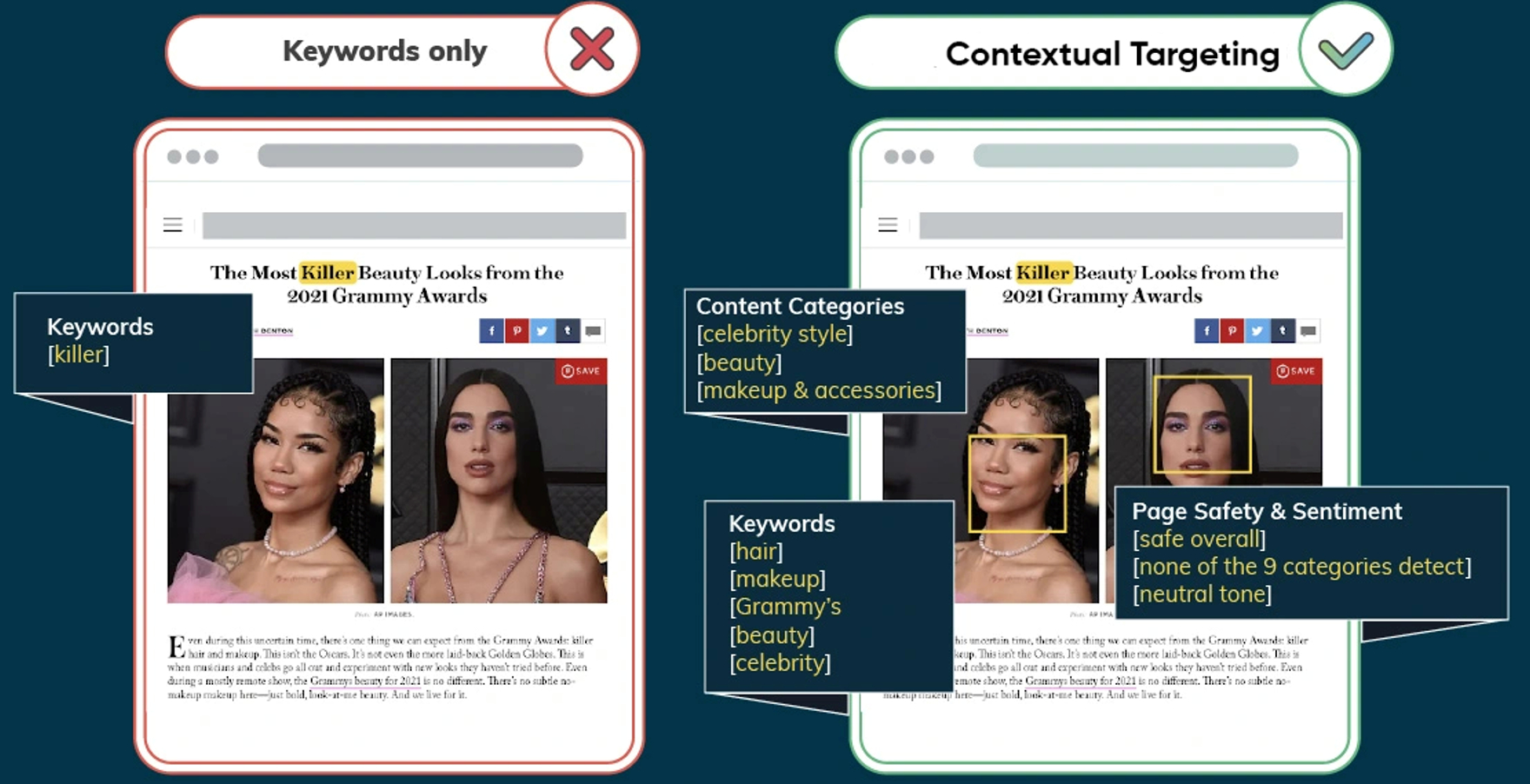 - Pre-Bid – for detection completed pre-bid, the main goal is to avoid unsafe content specific to an advertiser’s requirements, while some suitability analysis is also possible.