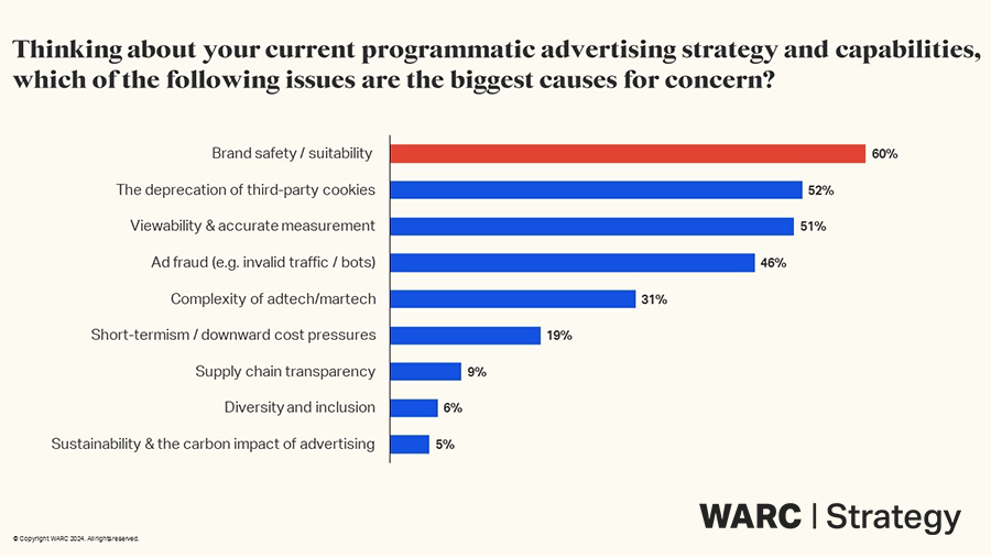 In Australia trust in brands is particularly high (according to Roy Morgan’s Risk Monitor), so maintaining a positive reputation is critical and a single messaging misplacement can harm years of investment and goodwill. A US-based WARC survey from late last year had this issue at the very top of the list of key concerns for advertisers and agencies leveraging programmatic advertising (as per image below).