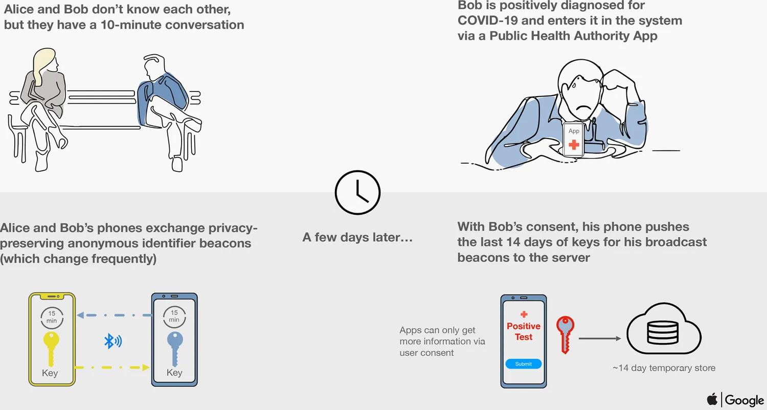 A very real-world example of leveraging MPC capabilities was the ‘Privacy-Preserving Contact Tracing‘ initiative jointly run by Apple and Google (click here for more info) to help trace and contain the spread of coronavirus during the pandemic (as per image below).