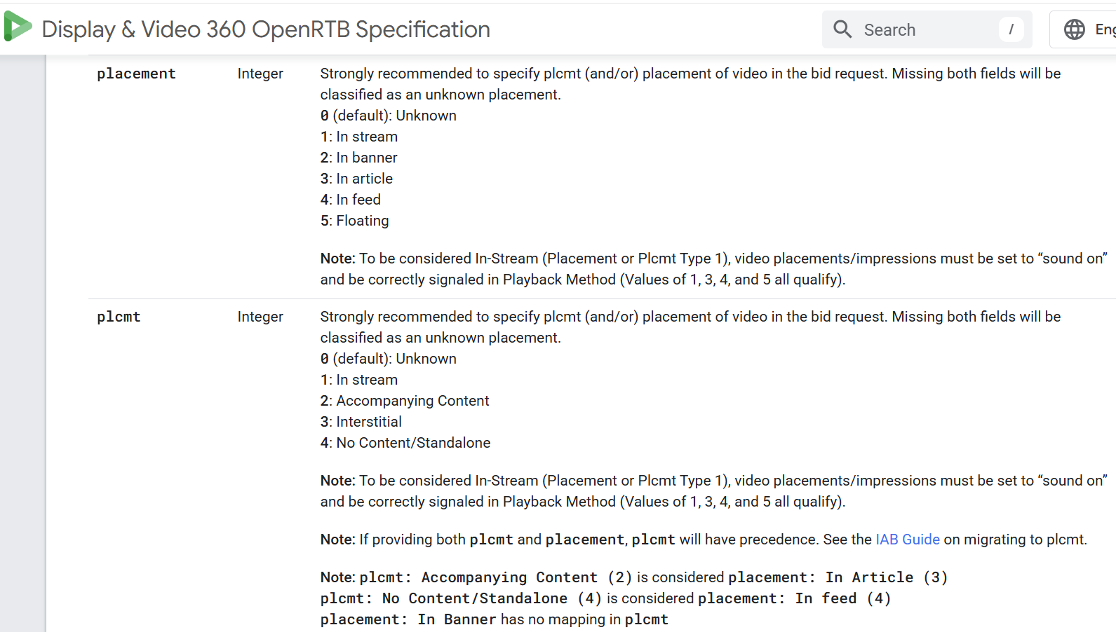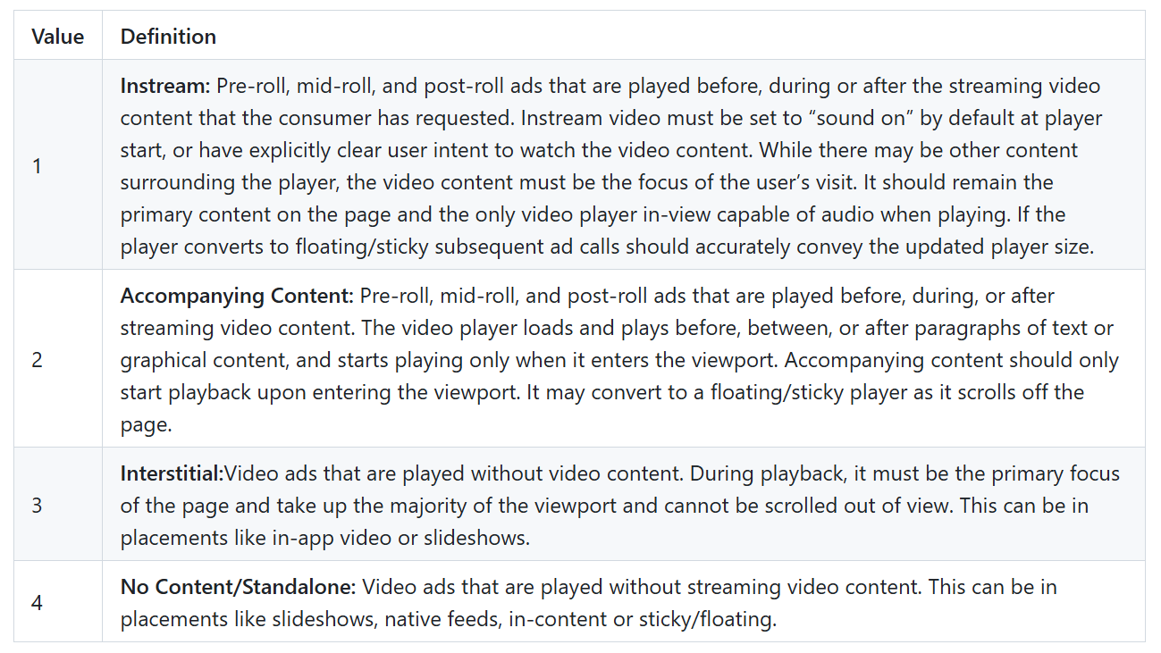 As per the DV360 provided table above, Publishers can now identify video ad opportunities for buyers using 1-4 in the PLCMT field as one of the four new placement types. SSPs will pass these declarations onto DSPs for buyers to access. So, just as a reminder: