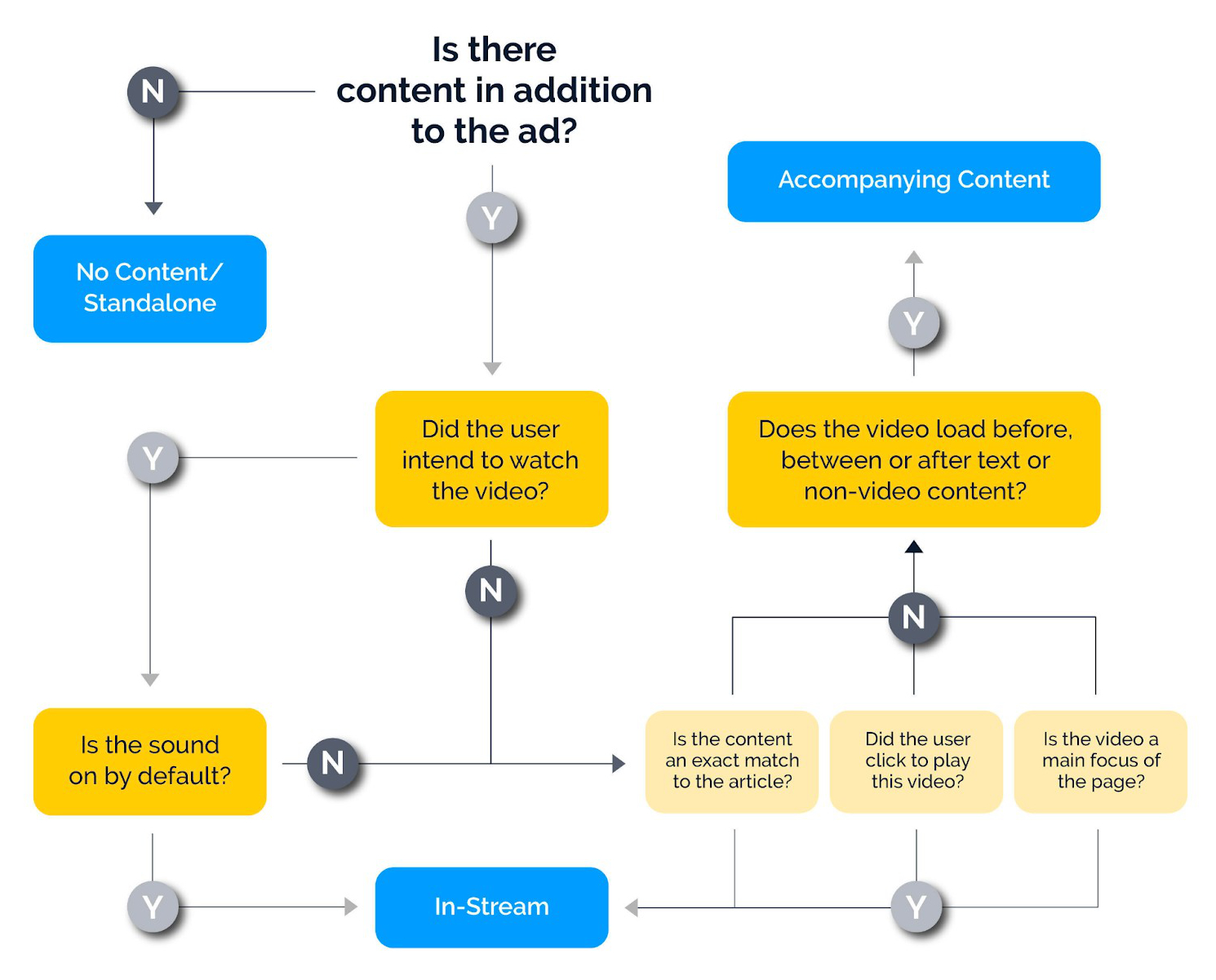 The other 3 non-instream ad opportunities cover a range of ad experiences from pre-roll or mid-roll in an autoplay video that has the sound off by default, or floating autoplay videos that appear alongside non-video content. Under these new guidelines, publishers can no longer label this type of video as instream within bid requests. The most common of the 3 non-instream types will likely be Accompanying Content, and we found the workflow diagram below is quite helpful:
