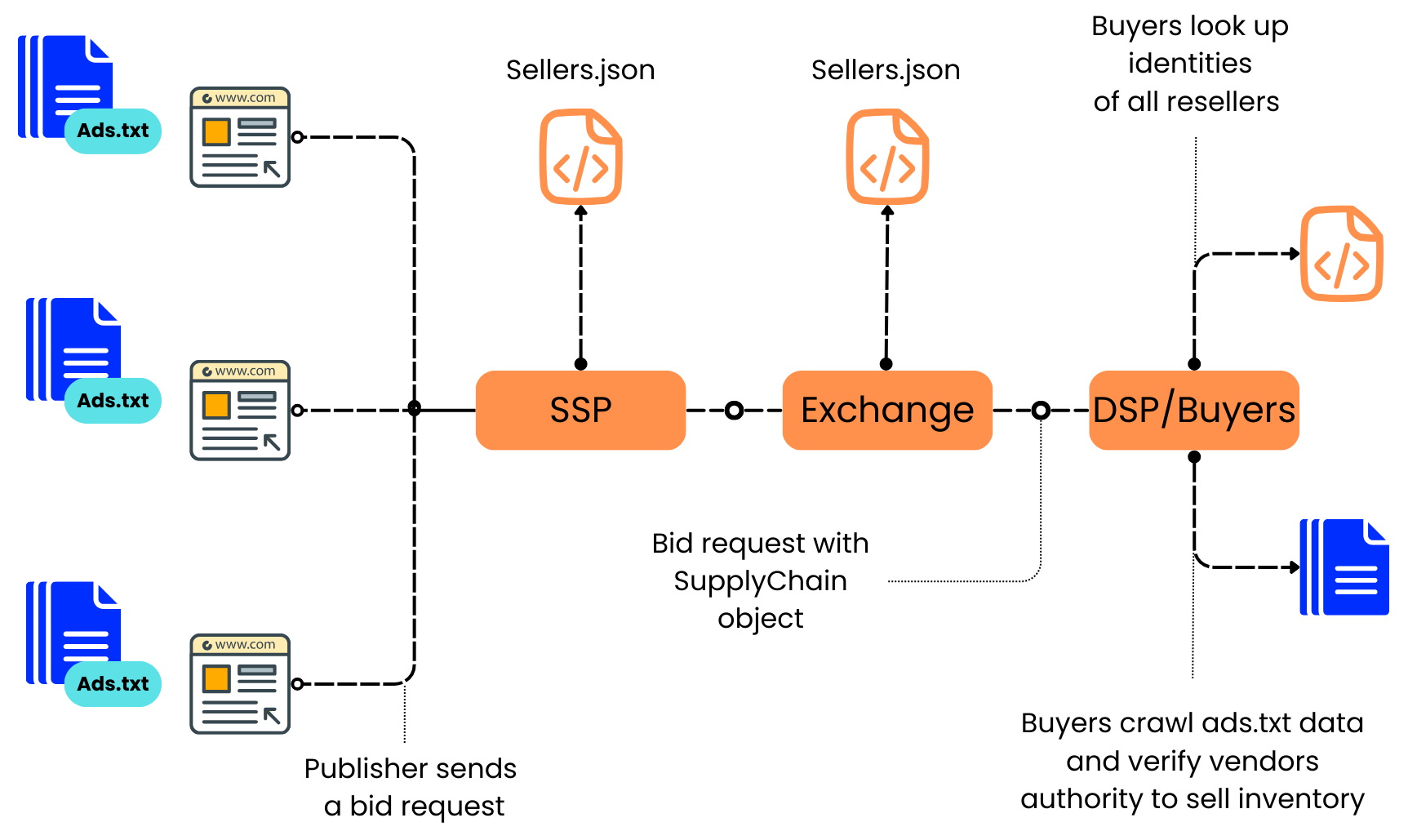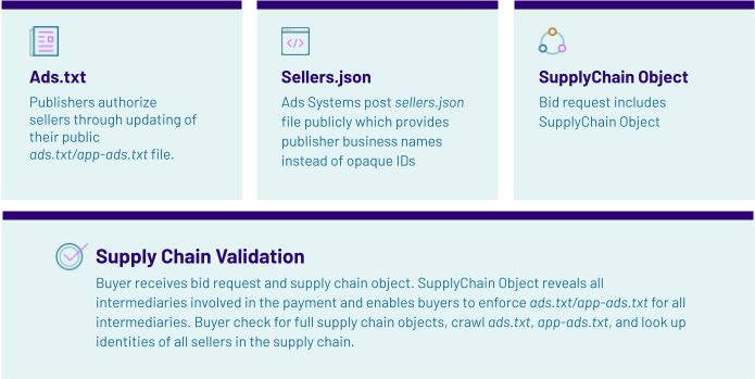The design of these standards is to enable buyers to be able to easily validate their inventory by automating the matching of data from a bid request (using SupplyChain Object) against data from the publisher (using ads.txt or app-ads.txt) and also ad tech vendors (using sellers.json). This provides full insight into all the seller accounts a bid request has passed through on the way to the buyer, showing exactly which entities were involved in the sale of a specific impression and where the related payments have flowed.