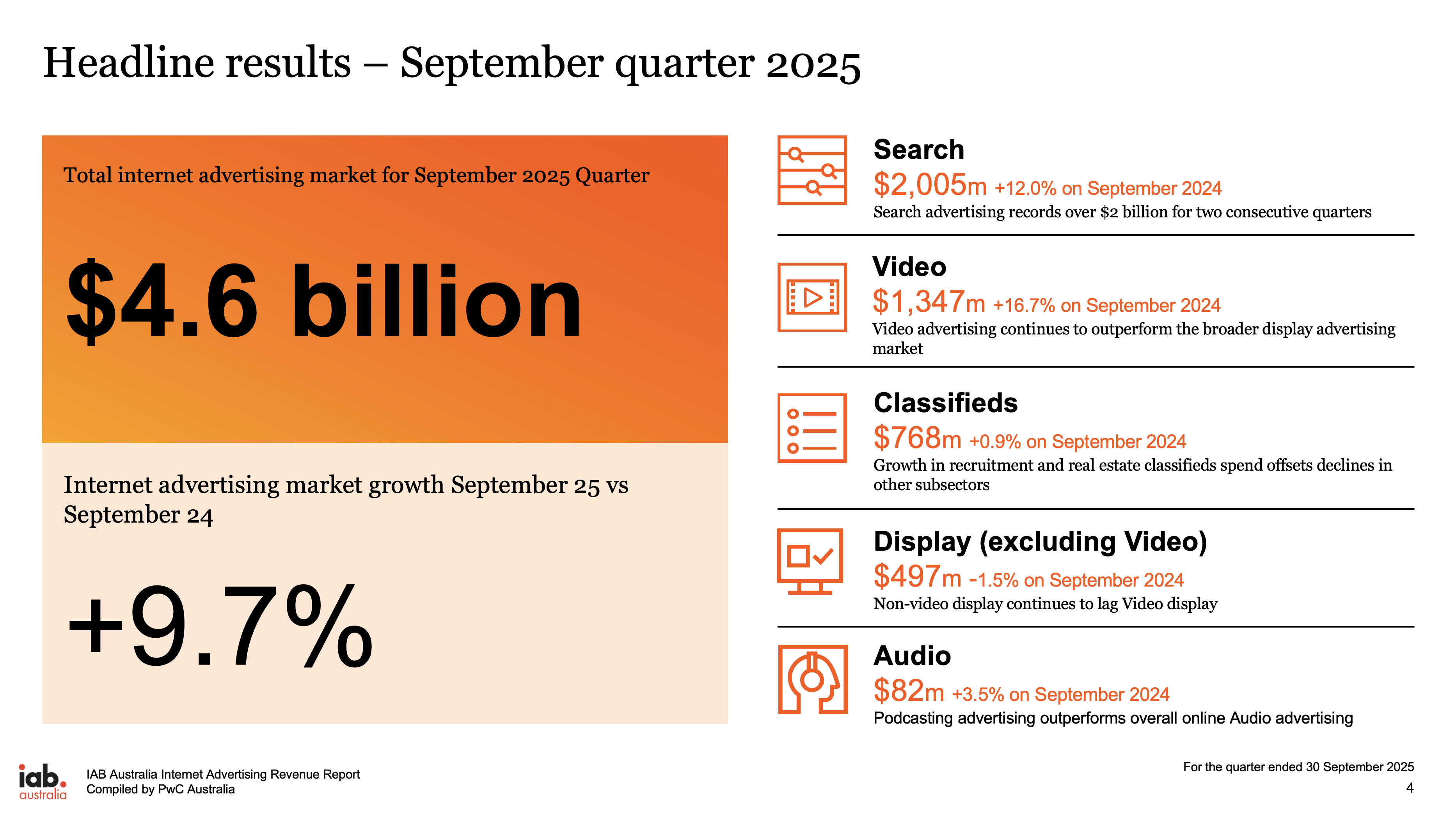 Internet advertising spend increases 9.7% year on year to reach $4.6billion in September 2025 quarter