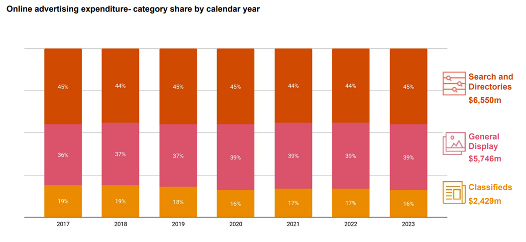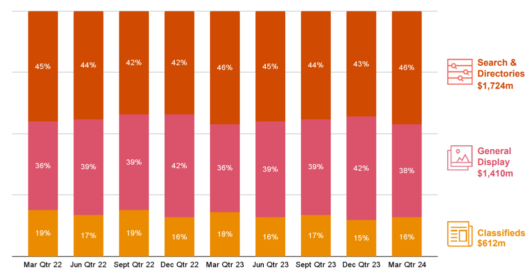 Comparing the quarter ending Dec 23 to the one ending March 24, overall digital advertising in Australia was down 4.2% from $3,912m to $3,746m (A pretty standard seasonal dip) and the latest SMI results show overall ad spend continuing to fall with a 6.6% decrease in March 2024.