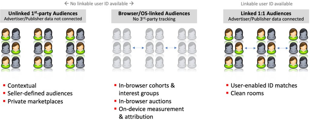 This approach is a key part of the proposed standard for ‘Best Practices for User-Enabled Identity Tokens Guidelines‘ which was one of the four standards recently released within the draft technical standards and guidelines for addressability, privacy and accountability. This is the option of having 1:1 linked audiences (see the third category on the far right in the image below) between publishers and advertisers, using either an explicitly opted-in device-based ID or a secure user-enabled ID. This has to be secured, have transparent uses, and offer consumer privacy-focused controls.